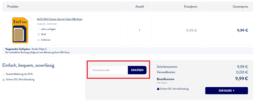 - Gib hier deinen ALDI Talk Rabattcode ein und klicke auf “Einlösen”.