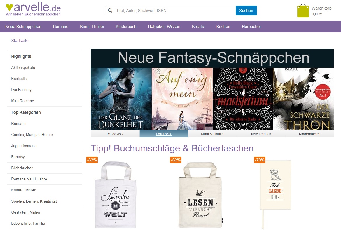 Wenn es um Bücher geht, ist Arvelle die perfekte Adresse. Ihr bekommt eine große Auswahl an Bücher in den Kategorien Romane, Krimi & Thriller, Kinderbücher, Ratgeber & Wissen, kreativ, Kochen sowie Hörbücher geboten. Der Unterschied zu anderen Anbietern wie Thalia oder Hugendubel wird sehr schnell anhand der Preise deutlich. Arvelle verkauft zum größten Teil “Mängelexemplare”, die häufig aufgrund z.B. eines Eselsohres nicht mehr zum vollen Preis verkauft werden können, ansonsten aber absolut top und ungebraucht sind. Daher sind Preisnachlässe bis zu 90% möglich! Allerdings können die größten Sparfüchse unter euch schauen, ob sich nicht noch der eine oder andere Arvelle Gutschein verwenden lässt.