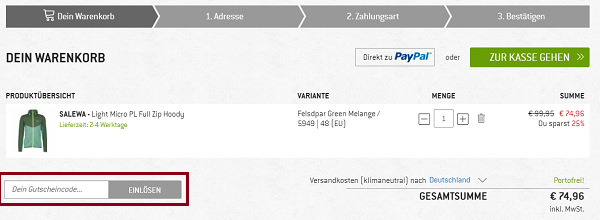 - Links unterhalb der Artikel befindet sich das Feld „Dein Gutscheincode“, in welches du deinen Bergfreunde Code einfügst. Vergiss nicht auf „Einlösen“ zu klicken. Die Bestellsumme verringert sich automatisch um den Gutscheinwert.
