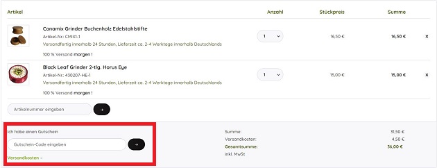 - Nun gelangst du zur Warenkorb-Übersicht und kannst deinen Black Leaf Gutschein in das entsprechend dafür vorgesehene Gutscheinfeld eingeben.