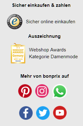 Hinweis: Bonprix behält sich vor zu bestimmten Produkten nur einzelne der genannten Zahlungsmöglichkeiten anzubieten. Die Zahlungsarten Paypal, paydirekt und Sofortüberweisung gelten beispielsweise nur für sofort lieferbare Artikel. Außerdem ist eine Zahlpause möglich. Bequem zahlt ihr erst nach 111 Tagen per Überweisung oder Bankeinzug.