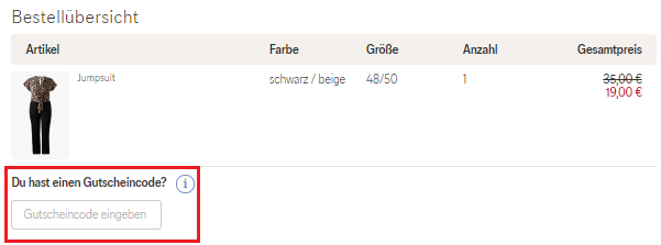 Nachdem ihr ausgiebig gestöbert habt, führt euch ein Klick oben rechts zu eurem gefüllten Warenkorb. Bevor ihr nun weiter zur Kasse geht oder direkt mit PayPal bezahlt könnt ihr hier nun noch euren C&A Rabattcode einlösen. Ihr findet das Gutscheinfeld unterhalb eurer Preisübersicht. Dann einfach auf “Rabattcode hinzufügen” klicken und den Code in das Feld eingeben. Jetzt nur noch auf “Jetzt einlösen” klicken und schon wird der Rabatt vom Gesamtbestellwert abgezogen.