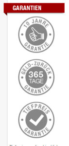 Vorteil: Die Gerätegarantie bleibt bestehen. Falls ein Druckerhersteller die Verwendung nicht originaler Tinte monieren sollte, garantiert Druckerzubehoer.de die Übernahme der Reparaturkosten. Neben dem gesetzlichen 14-tägigen Widerrufsrecht wirbt der Online Shop mit einer 365-tägigen Geld-zurück-Garantie auf unbenutzte Produkte.