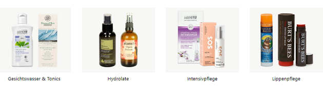 Die Pflegeprodukte in den einzelnen Kategorien können noch zusätzlich gefiltert werden. Ihr könnt nach Hauttyp, Marke oder, je nach dem, was euch am Herzen liegt ihr, nach folgenden Eigenschaften filtern: