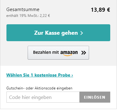 Als besonderes Extra fügt Ecco Verde jeder Bestellung (egal wie hoch der Bestellwert) eine kostenlose Probe bei. Ab einem Warenwert von 35€ erhaltet ihr zwei gratis Proben und ab einem Warenwert von 60€ sogar drei Proben for free. Dazu einfach im Warenkorb auf das Feld „Wählen Sie 1 kostenlose Probe“ anklicken und direkt eine der zahlreichen Naturkosmetik-Probeprodukte oder eine Überraschungsprobe auswählen.