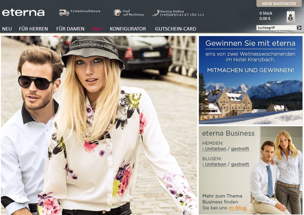 Eterna.de ist der Online-Shop des traditionsreichen deutschen Bekleidungsunternehmens Eterna. Hier findet Ihr Oberbekleidung wie Hemden und Blusen, Strickpullover oder Accessoires wie Schals und Manschettenknöpfe.