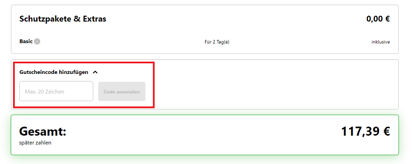 Bei einigen Europcar Rabattaktionen wird kein Code benötigt, der Rabatt wird automatisch reduziert angezeigt. Bei anderen Aktionen wiederum muss ein Europcar Gutscheincode eingegeben werden. Nachdem ihr Euch für einen Europcar Gutschein bei Unideal.de entschieden habt, kopiert ihr den Code und gebt ihn einfach in Schritt 4 „Überprüfen und buchen“ des Bestellvorgangs ein. Dort findet ihr ganz unten das Feld “Gutscheincode hinzufügen”. Fügt euren Voucher dort ein, klickt auf “Code anwenden” und schon wird der Rabatt automatisch von der Gesamtsumme abgezogen.