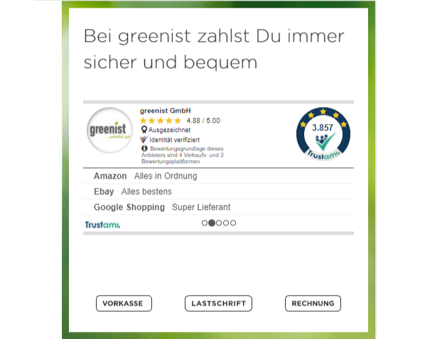 Bei greenist kannst du bequem per Vorkasse, Lastschrift und auf Rechnung zahlen. Auch eine Sofortüberweisung sowie eine Zahlung über amazon pay und PayPal sind möglich.