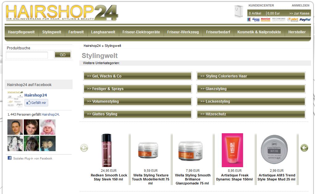 Der Onlineversandhandel Hairshop24 bietet Friseur- und Kosmetikbedarf für Profis und Endverbraucher an. In dem riesigen Sortiment findet Ihr Produkte von bekannten Herstellern zu günstigen Preisen. Das Menü des Onlineshops Hairshop24 ist in verschiedene Kategorien aufgeteilt. So findet Ihr etwa in der Haarpflegewelt Shampoos, Spülungen und Kuren für jeden Haartyp. In der Kategorie Stylingwelt werden Haarsprays, Festiger und Gele angeboten.