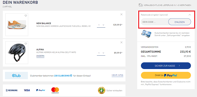 3. Rechts neben den Produkten findest du das Feld „Rabattcode eingeben“. Hierhin kopierst du deinen Coupon. Vergiss nicht auf „Einlösen“ zu klicken, damit dir der Gutscheinwert abgezogen wird!