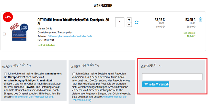 - Rechts unterhalb der Artikel findest du den Kasten mit Feld „Gutscheine“, in welches du deinen iPill Code einfügst. Vergiss nicht auf „In den Warenkorb” zu klicken. Die Bestellsumme verringert sich automatisch um den Gutscheinwert.