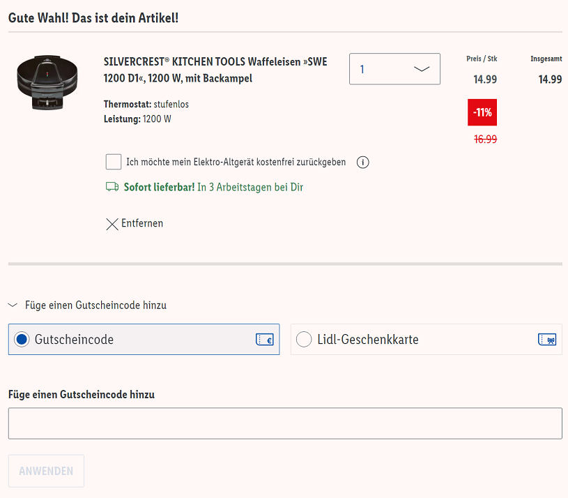 Als 3. Schritt gelangst du zur Zusammenfassung deiner Bestellung. Erst hier kannst du den Lidl Rabattcode eingeben. Klicke dafür einfach auf das Feld „Füge einen Gutscheincode hinzu“. Hier kannst du nun deinen Lidl Gutscheincode eingeben und schon wird der Rabatt automatisch vom Gesamtbestellwert abgezogen. Fertig!