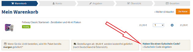 - Rechts unterhalb deiner Warenkorb-Übersicht befindet sich das Feld „Haben Sie einen Gutschein-Code?“. Klicke auf „Gutschein-Code eingeben“ und füge deinen Rabattcode ein.
