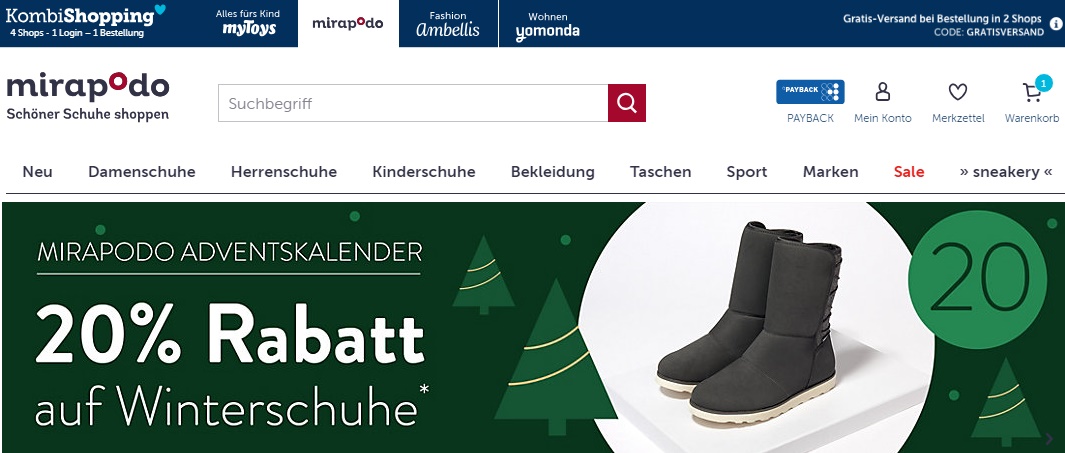 Neben eurem Mirapodo Gutschein könnt ihr bei dem Online Shop noch von einem ganz besonderen Angebot profitieren. Mit dem „KombiShopping“ könnt ihr mit nur einem Kundenkonto in 4 Shops einkaufen. Zusätzlich zu Mirapodo lässt sich so der Einkauf bei yomonda, myToys und Ambellis in eurer Bestellung kombinieren. Wer ein Payback Konto hat, kann außerdem bei jedem Einkauf Punkte sammeln.