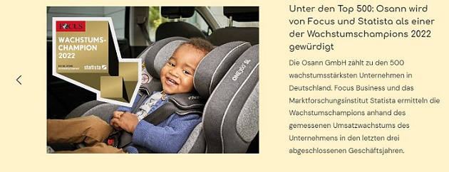 Mit seinen innovativen und hochwertigen Produkten hat das Unternehmen bereits einige Preise gewonnen. So wurde Osann 2022 für sein Kombi-Kinderwagenmodell „Olé“ mit dem „German Design Award“ geehrt. Außerdem gehört das Unternehmen laut Focus Business und dem Marktforschungsinstitut Statista zu den „Wachstumschampions 2022“ und ist damit eines der 500 Unternehmen mit dem größten Umsatzwachstum in den letzten 3 Jahren.