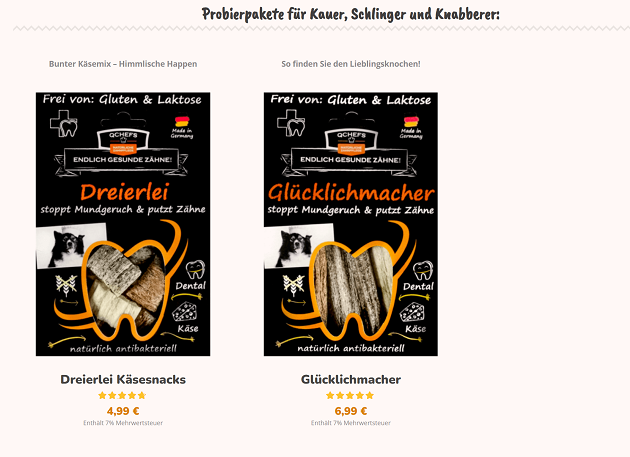 Hier findest du neben coolen Aktionsboxen und Bundles auch Probierpakete verschiedener Produkte. Die günstigen Probierpakete sind besonders dann zu empfehlen, wenn dein Vierbeiner ein kleiner Gourmet ist und du erstmal ausprobieren möchtest, ob die Dentalsnacks überhaupt seinem Geschmack entsprechen.