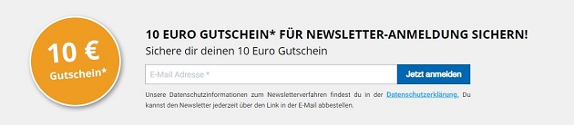 Wenn du den Newsletter abonnierst, erhältst du einen Gutschein in Höhe von 10 €. Einfach deine E-Mail-Adresse in das dafür vorgesehene Feld eingeben, auf „Jetzt anmelden“ klicken und Gutschein abstauben.