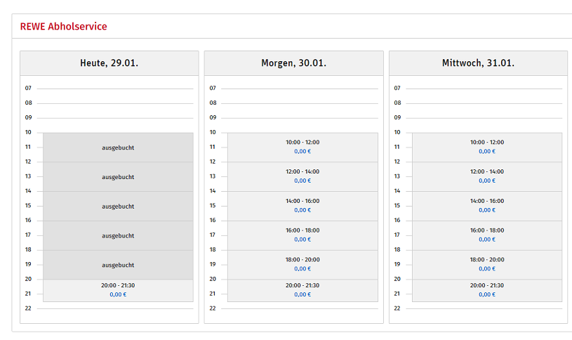 Beim Rewe Abholservice kannst du online deine Bestellung machen und die gewünschten Produkte dann an deinem Wunschtermin frühestens drei Stunden nach der Bestellung abholen. Es gibt dabei keinen Mindestbestellwert und es fallen keine Extrakosten an. Suche dir im Zeitfenster den passenden Abholtermin aus und bleib zeitlich flexibel!