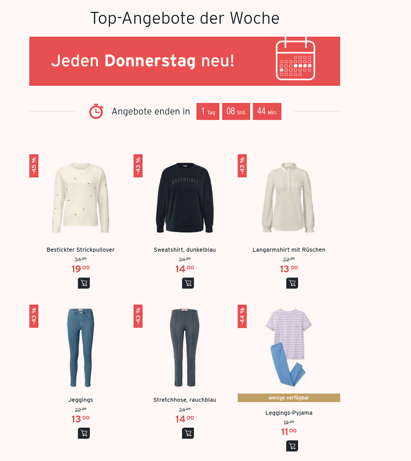 - Schaue regelmäßig im Sale-Bereich nach Produkten und achte auf die Deals der Woche. Dort findest du reduzierte Artikel und besondere Angebote.