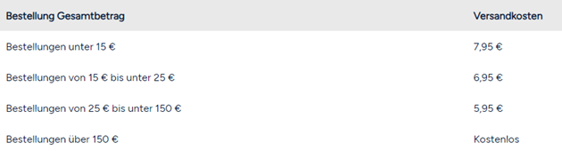 Ab einem Einkaufswert von 150 € übernimmt Topdrinks die Versandkosten. Darunter sind die Versandkosten je nach Bestellwert gestaffelt: für Bestellungen unter 15€ zahlst du 7,95€, für Bestellungen von 15-24,99€ zahlst du 6,95€ und für Bestellungen von 25€-150€ zahlst du 5,95€.