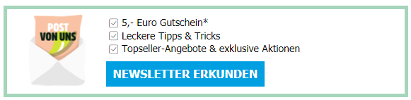 Meldet ihr euch für den Newsletter an, staubt ihr nicht nur einen 5€ Gutscheincode auf eure nächste Bestellung ab, sondern erhaltet regelmäßig leckere vegane Rezepte sowie Topseller Angebote und exklusive Angebote. Der Rabattcode ist ab Anmeldung sechs Wochen lang und ab einem Mindestbestellwert von 19€ gültig und nur einmal pro Kunde und Bestellung einlösbar.