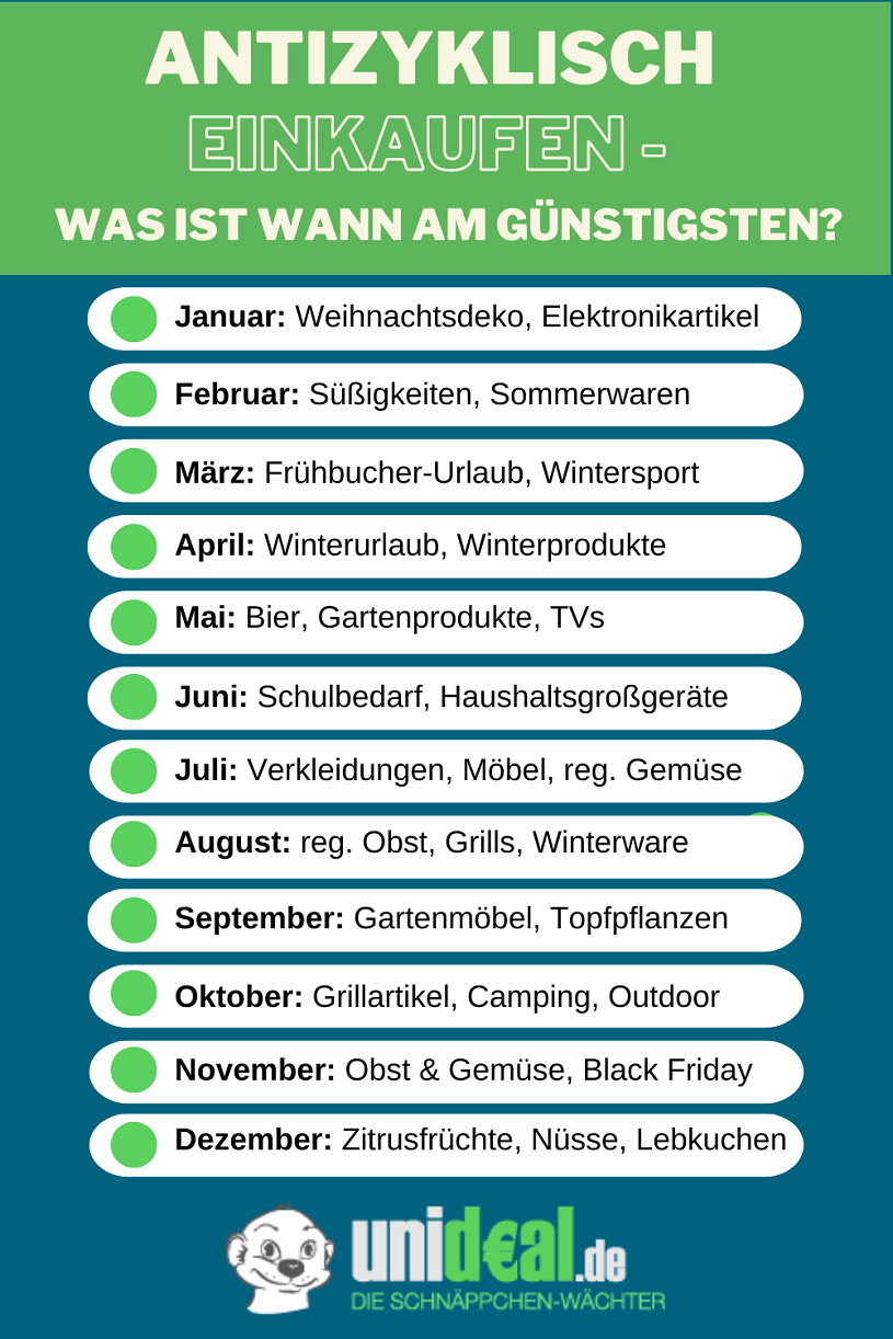 Antizyklisch kaufen leicht gemacht mit dem ultimativen Schnäppchen Kalender von Unideal. Monat für Monat kannst du damit einsehen, bei welchen Produkten gespart werden kann.