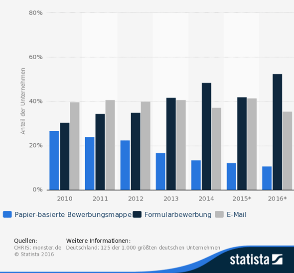 Im Jahr 2014 gaben nur 13,6% der befragten Unternehmen an, dass sie die papierbasierte Bewerbungsmappe bevorzugen. Die Tendenz dazu ist sinkend. In Zukunft wird es die Papierbewerbung daher schwer haben, wie die Prognose von Statista zeigt.
