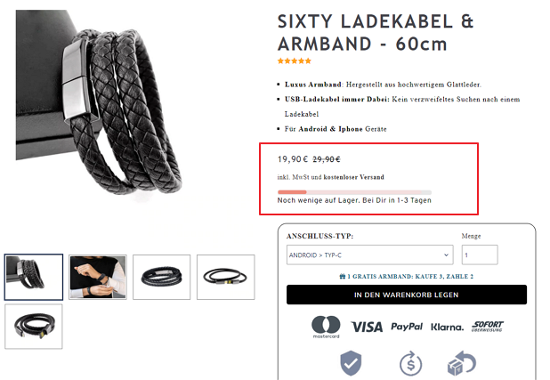 Durch eine Werbeanzeige bei Instagram wurden wir auf das Armband von “braleo.de” aufmerksam und haben das UBS Typ-C Armbandkabel gekauft. Die Webseite spielt mit den typischen psychologischen Tricks bei Online Shops: Preisreduktion, Verknappung und Kaufanreize stechen ins Auge. Man soll schnell ohne nachdenken bestellen.