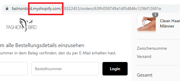 Beispiel für einen Shopify Shop. In der URL der Webseite taucht das Kürzel “myshopify” auf. Hier ist klar, dass es sich um einen privat betriebenen Shop handelt.