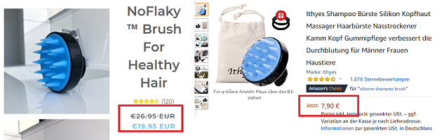 Kostenvergleich der NoFlaky Haarbürste gegenüber einer günstigen Alternative bei Amazon.