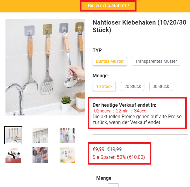 Das ist eine typische Masche von Fake Shops oder Shops, die billige Produkte verkaufen: Der Shop will, dass ihr euch von eurer ersten Intention leiten lasst und sofort kauft, ohne weitere Meinungen oder Produktangebote einzuholen.