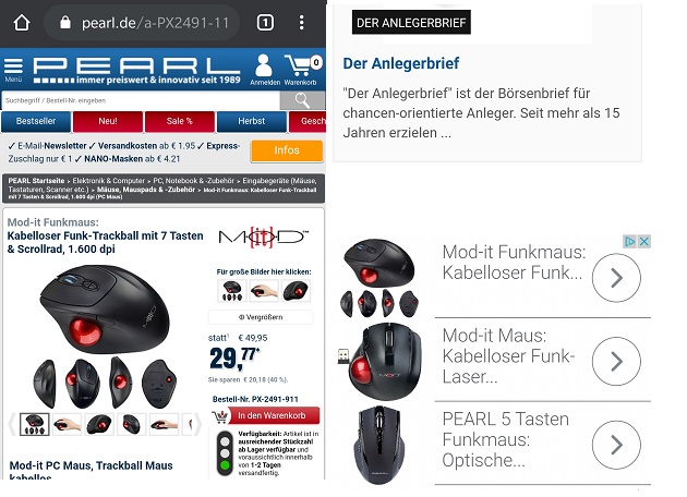 Links ein Shop, wo nach einem Produkt gesucht wurde. In einer anderen, kostenlosen App wird eine Werbung zu dem Produkt ausgespielt, was kurz davor angesehen wurde.