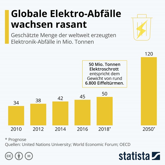 Wir alle haben unzählige alte und neue Technik- und Elektrogeräte zuhause herumliegen – und stetig werden neue Technikprodukte erfunden und hergestellt. Elektroschrott-Müllberge sind eine der am schnellsten wachsenden Müllhalden unserer Erde. In Deutschland alleine werden pro Jahr 1,7 Millionen Tonnen E-Schrott produziert. Und Elektroabfälle steigen weltweit rasant an – eine Prognose besagt für 2050 eine geschätzte Menge von 120 Millionen Tonnen von weltweit erzeugten Elektronik-Abfällen.