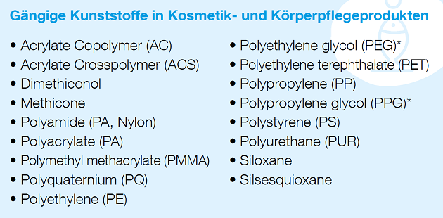 Verständliche Erklärungen müssen nicht erfolgen, sodass der Verbraucher mit den Abkürzungen meist nichts anfangen kann. Diese geben für den Laien nur verschlüsselt wieder, ob Kunststoffe wie Mikroplastik in dem Produkt enthalten sind. Eine Kennzeichnungspflicht für Kunststoffe gibt es leider (noch) nicht – diese wäre jedoch sehr hilfreich.