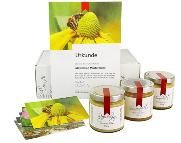 Bienen sind unersetzliche Helfer für die Bestäubung von Nutz- und Wildpflanzen. Ihr möchtet einen Beitrag dazu leisten, die nützlichen Insekten zu schützen? Dann verschenkt doch eine Patenschaft für ein Bienenvolk! Für dieses wird gesorgt und der Beschenkte erhält eine schöne Geschenkbox mit persönlicher Geschenkurkunde, 3 Gläser Honig und Informationen über das Bienenvolk. Dieses kann auch vor Ort besucht werden und das Bienenvolk so hautnah erlebt werden!