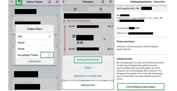 Im DB Navigator ist die Ticket Erstattung einfach. Im Menüpunkt „Reisen“ könnt ihr unten unter “Vergangene Reisen” auswählen, so dass euch nicht nur gültige Tickets angezeigt werden, sondern auch bereits vergangene Fahrten. Wählt dann die betroffene Buchung aus, klickt unten auf „Weitere Aktionen“ und dann auf „Entschädigung beantragen“. Ihr werdet dann automatisch durch alle nötigen Angaben geführt.