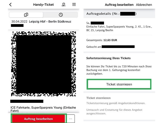 Falls ihr über den DB Navigator gebucht habt, könnt ihr ganz einfach unter „Reisen“ die betroffene Buchung auswählen. Klickt dann auf „Auftrag bearbeiten“ und storniert euer Ticket.