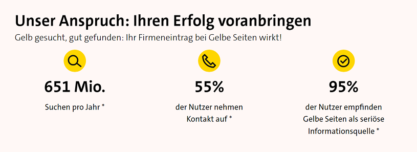 Auch der Klassiker unter den Unternehmensverzeichnissen, die Gelben Seiten, bieten eine gute Möglichkeit, euer Business sichtbarer zu machen. Das etablierte und allseits bekannte Branchenverzeichnis hat mittlerweile mit 651 Million Suchen pro Jahr eine große Online-Präsenz und sollte unbedingt in Bezug auf die Sichtbarkeitsstrategie eures Unternehmens berücksichtigt werden. Auf den Gelben Seiten könnt ihr ganz einfach und in nur wenigen Schritten einen Firmeneintrag erstellen und so online über euren Eintrag gefunden werden. Der Grundeintrag ist dabei genau wie bei Google Business kostenlos. Um die Reichweite und Sichtbarkeit eures Unternehmens noch zusätzlich zu pushen, empfehlen wir dir den Startseiteneintrag. Dieser Eintrag ermöglicht ein besseres Ranking in der Trefferliste bei Suchanfragen sowie eine Eintragsseite völlig ohne Werbung. Ihr könnt den Startseiteneintrag sogar 3 Monate kostenlos testen. Anschließend zahlt ihr 29,90 pro Monat.