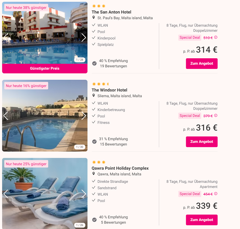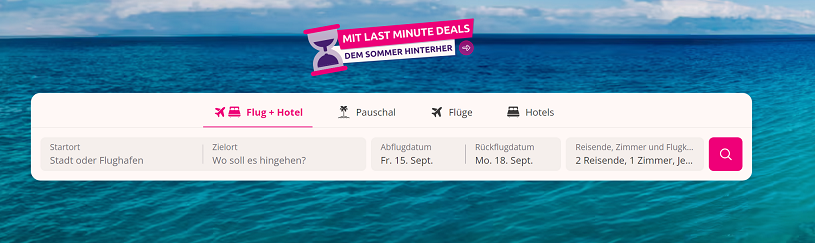 Zunächst wählst du eine der beiden Reisekategorien (Flug + Hotel oder Pauschalreise) aus und gibst deine gewünschten Reisedaten in die entsprechenden Felder ein und klickst du die Lupe. Anschließend werden dir alle für dich passenden Angebote angezeigt.