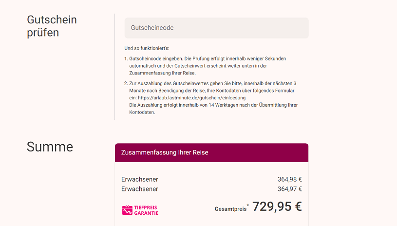 Nun wählst du dein Lieblingsangebot aus und klickst auf „Zum Angebot“. Wenn alles so weit passt, kannst du auf „Angebot prüfen“ klicken und gelangst so zur Buchungsübersicht. Hier findest du nun oberhalb der Gutscheinsumme ein Gutscheinfeld. Hier gibst du nun den passenden Lastminute.de Gutscheincode ein und erhältst automatisch den 50€ Lastminute.de Rabatt.
