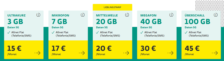 Du kannst bei WEtell zwischen den folgenden Tarifoptionen wählen: Ultrakurz, Mikrofon, Mittelwelle, Megafon und Überschall. Alle Tarife sind monatlich kündbar, im performante 5G Netz und variieren preislich zwischen 15 und 45€.