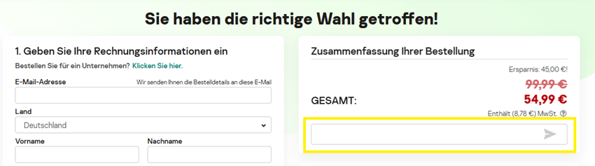 Den Rabatt zu nutzen, ist ganz einfach: Klicke bei Unideal.de auf den grünen Button “10% Kaspersky Gutscheincode auf Premium anzeigen”. Ein neuer Reiter mit einem Code erscheint, kopiere dir diesen heraus. Gleichzeitig wirst du zum Onlineshop von Kaspersky weitergeleitet. Lege das Kaspersky Premium Abo für 1 Jahr in den Warenkorb und gehe zur Kasse. Suche dort unter der Zusammenfassung deiner Bestellung die blaue Schrift: “Haben Sie einen Gutscheincode?” und klicke darauf. Ein neues Feld öffnet sich, dort kannst du den vorhin herauskopierten Code eingeben. Klicke nun auf den grauen Pfeil und schon wird der Rabatt von 10% von der Gesamtsumme abgezogen. Nun kannst du deine Bestellung wie gewohnt abschließen und dir die Software downloaden.