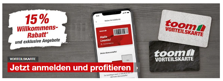 Alle, die regelmäßig Ihren Einkauf bei toom tätigen, können mit der toom Vorteilskarte als Neukunden 15% Rabatt abstauben!