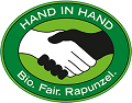 Rapunzel Hand in Hand: Zeichen des Bioanbieters Rapunzel, das gerecht gehandelte Ware kennzeichnet