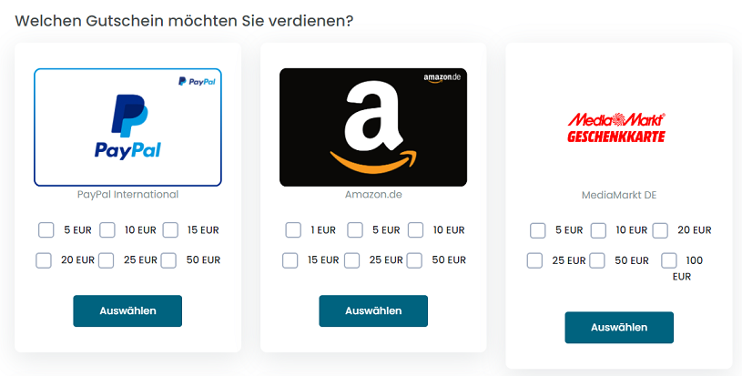 Hier möchten wir noch einmal die Besonderheit hervorheben, dass man bei diese Art Umfragen nicht ein Guthaben anspart, dass dann als Summe ausgezahlt wird, sondern auf einen Einkaufsgutschein deiner Wahl. So kannst du zum Beispiel auf einen 10€ Voucher deines Lieblingshops sparen. Besonders niedrigschwellig kann man einen Amazon Gutschein verdienen, da sich dieser schon bei Erreichen von einem Guthaben von 1€ auszahlen lässt.